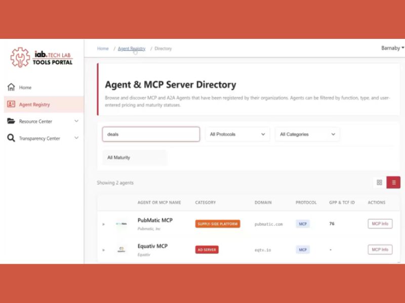 Aquí es donde entra en juego el Registro de Agentes de IAB Tech Lab, un catálogo de servicios automatizados de tecnología publicitaria proporcionados por algunos de los actores más importantes del sector, como Google, Amazon, PubMatic, Equativ y más de una docena de empresas adicionales. Está diseñado para que los agentes de IA puedan descubrir herramientas, acceder a funcionalidades y coordinar tareas sin necesidad de integraciones personalizadas para cada plataforma.