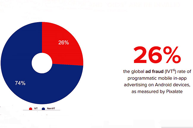 La conclusión general es que más de una cuarta parte (26%) de las impresiones programáticas de anuncios en la aplicación fueron fraudulentas, lo que indica que el tráfico no válido (IVT) es un problema costoso para los marketers de telefonía móviles. Pixalate también descubrió que muchas aplicaciones en la tienda Google Play amenazan la seguridad de la marca, la privacidad del consumidor y la seguridad nacional. Dijo que 31 mil aplicaciones de Android posiblemente no eran seguras para las marcas debido a contenido objetable como blasfemias, violencia y pornografía. Esas aplicaciones generaron el 32% de las impresiones publicitarias programáticas globales en el tercer trimestre, en comparación con el 27% en el primer trimestre, una tendencia preocupante para los vendedores móviles, por Pixalate.