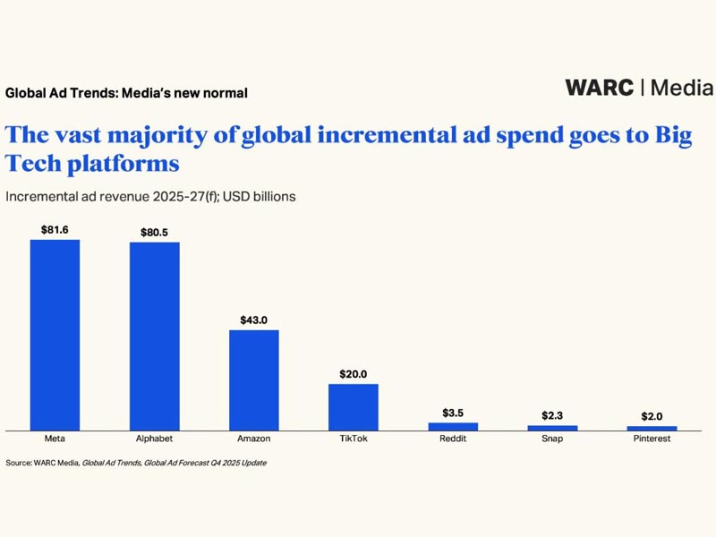 Las últimas previsiones muestran que los beneficios de las sólidas perspectivas de crecimiento global no se distribuirán equitativamente. Alphabet, Meta y Amazon absorberán en conjunto la mayor parte del incremento de la inversión publicitaria global entre 2025 y 2027, aumentando su cuota de mercado publicitario global, excluyendo a China, al 58,8% al final del período de previsión.