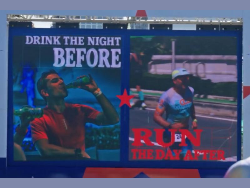 Ese momento también formó parte de la acción creativa. Durante la velada, se capturaron imágenes de los corredores brindando con Heineken 0.0. Al día siguiente, durante el tramo de la competencia en el que los atletas realizan la parte de correr, se instaló una gran pantalla que los enfocó en vivo mientras pasaban por el recorrido. En ese momento, la pantalla se dividía y mostraba junto a su imagen actual una fotografía del atleta tomada la noche anterior disfrutando de una Heineken 0.0, acompañada del mensaje de la campaña: “Beber la noche anterior, correr al día siguiente. Ahora puedes.”